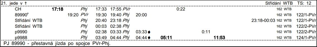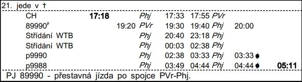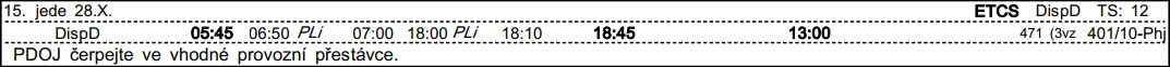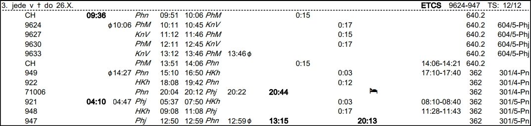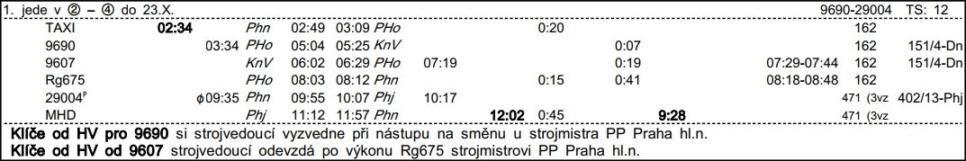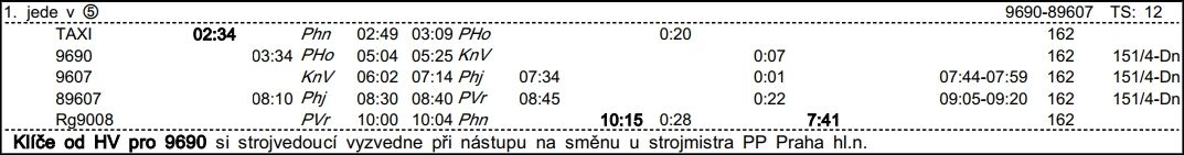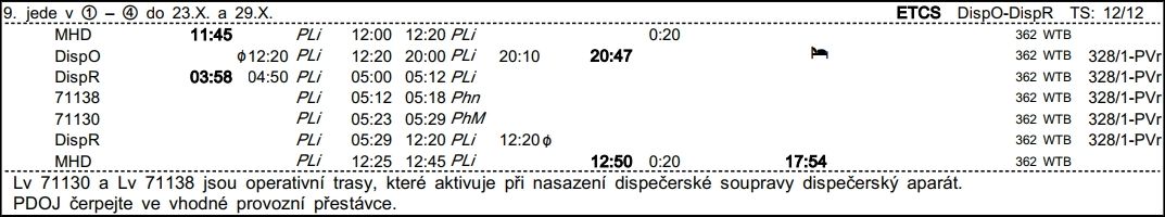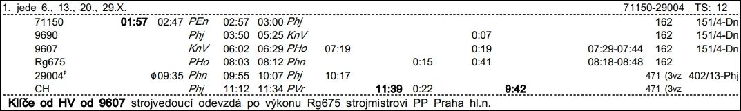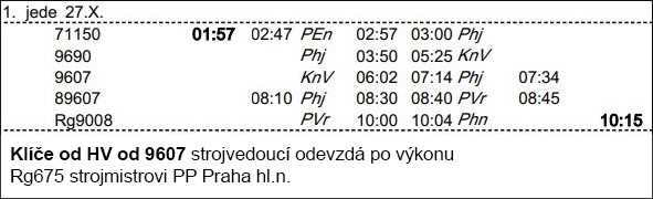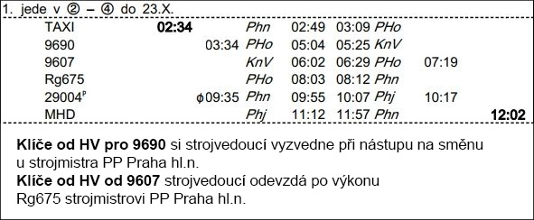 ❯ Dispečerská souprava nocuje v depu Libeň, Odpočinek je zajištěn na nocležně SS Praha Libeň. Klíče si strojvedoucí vyzvedne u strojmistra SS Praha Libeň.