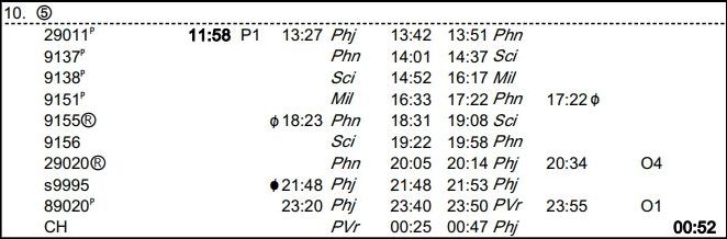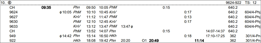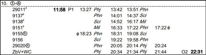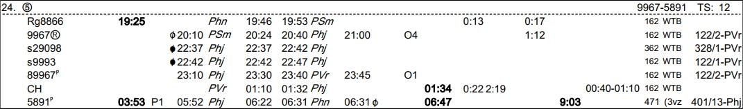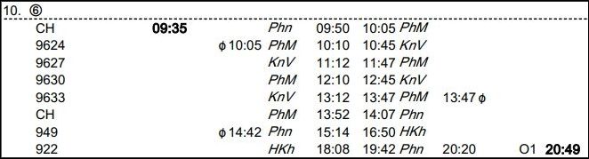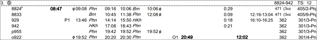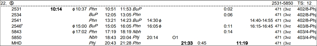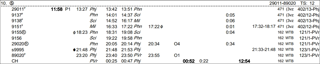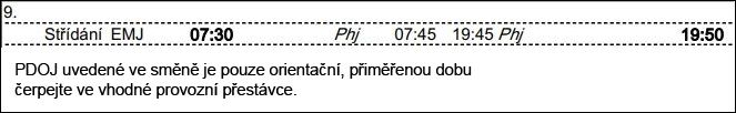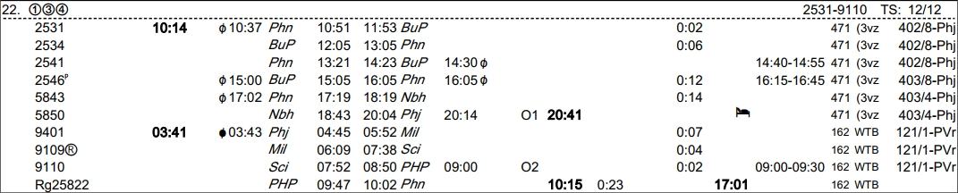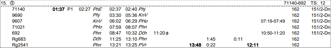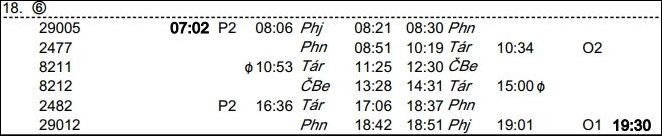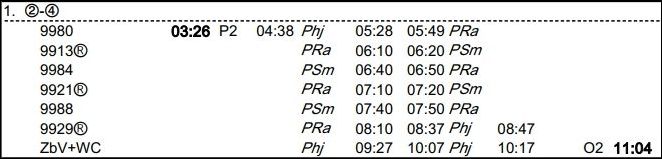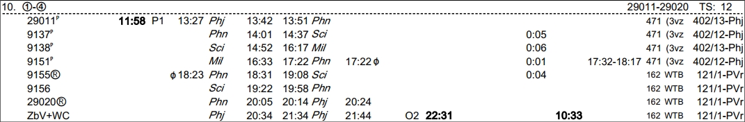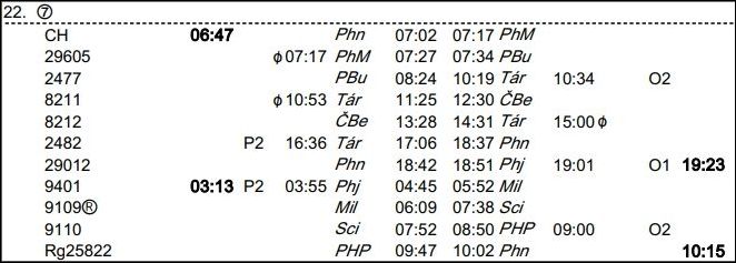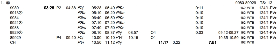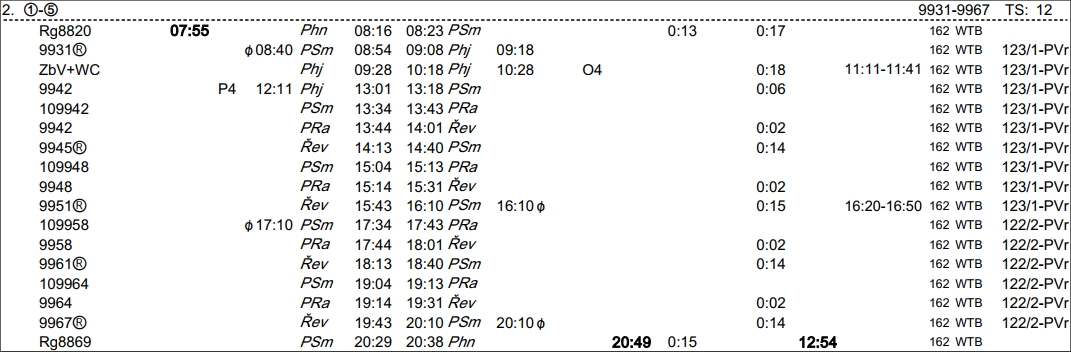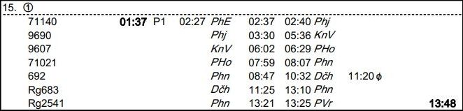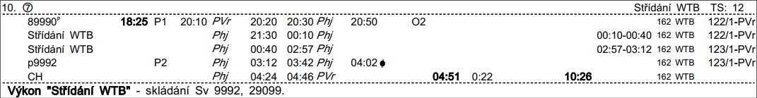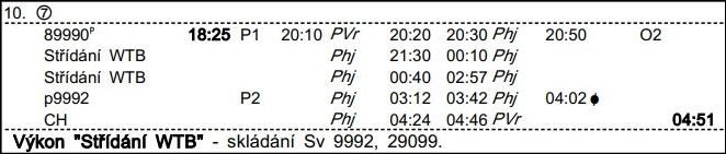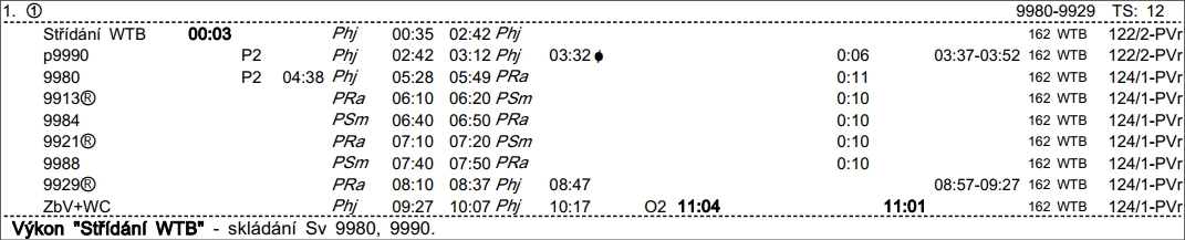 ❯ 9990 - Soupravu vyvézt na čas osy do koleje „A“, kde proběhne domluvené střídání (osa) se strojvedoucím DC. Pokud se strojvedoucí v čase osy nedostaví, soupravu vyvézt k výpravčímu. Odjezd v 4:02.