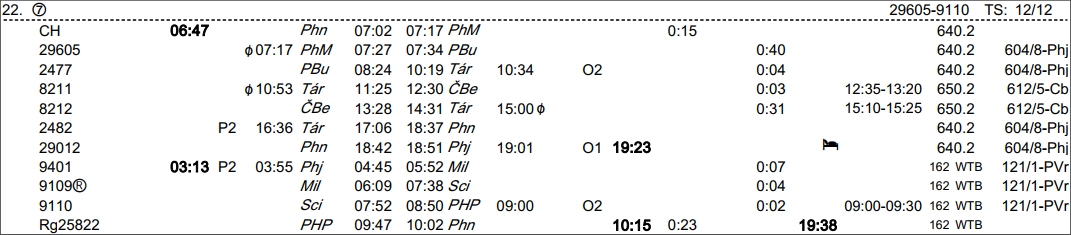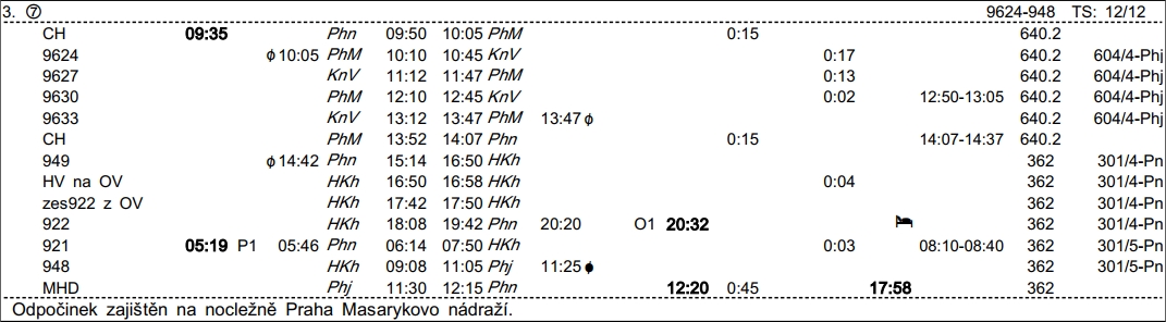 ❯ Dispečerská souprava nocuje v depu Libeň. Odpočinek je zajištěn na nocležně SS Praha Libeň. Klíče si strojvedoucí vyzvedne u strojmistra SS Praha Libeň.