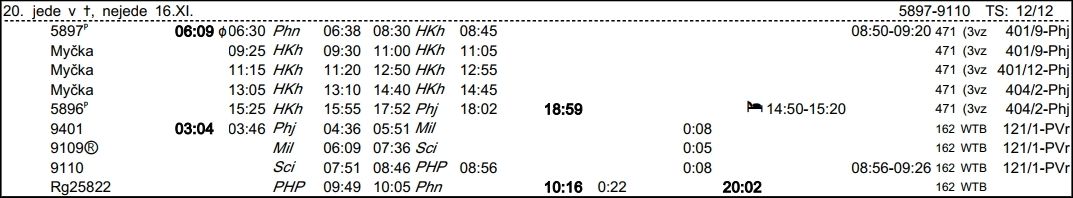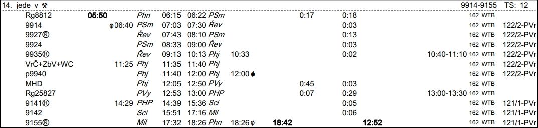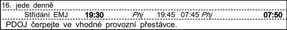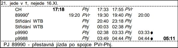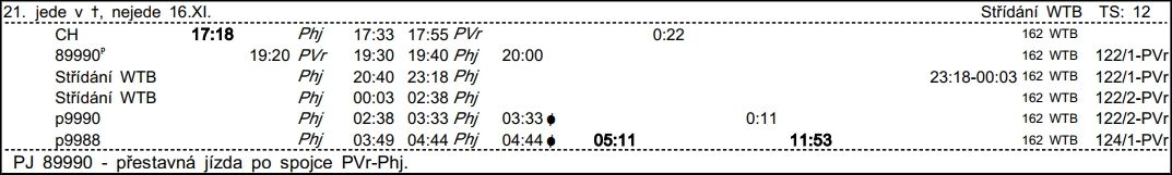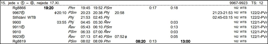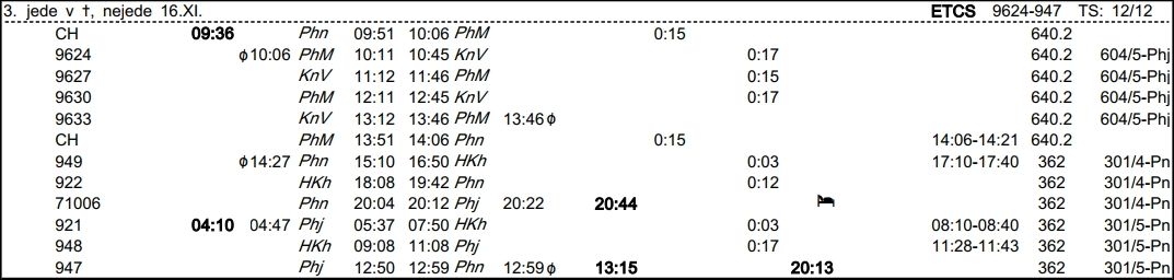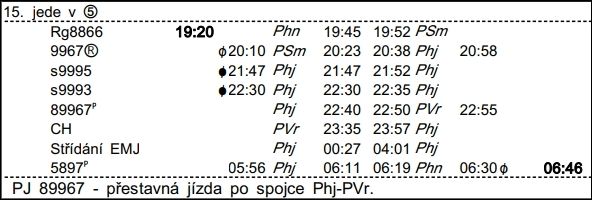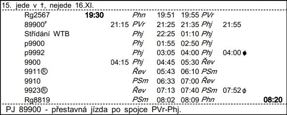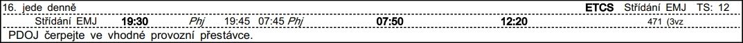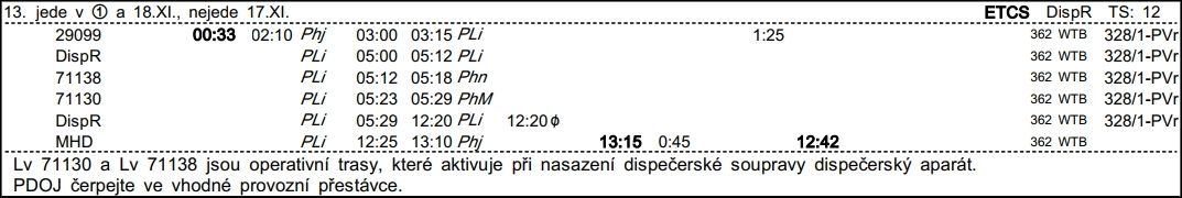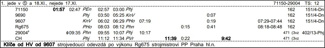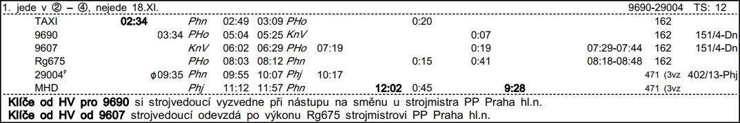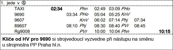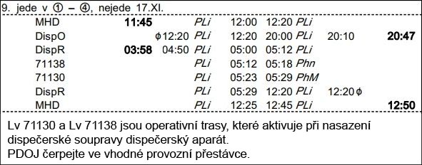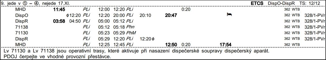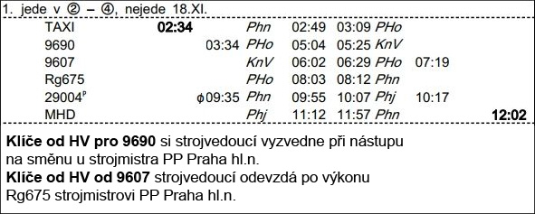 ❯ Dispečerská souprava nocuje v depu Libeň, Odpočinek je zajištěn na nocležně SS Praha Libeň. Klíče si strojvedoucí vyzvedne u strojmistra SS Praha Libeň.